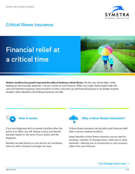 E4E Relief provides each regular employee who works 30 hours or more per week the opportunity to purchase Critical Illness insurance from Symetra. This coverage will offer financial support if you are diagnosed with a covered critical illness. Coverage is guaranteed issue and is available for spouses and children. There is a pre-existing condition limitation of 12 months for any condition for which treatment was received in the 12 months prior to the effective date.